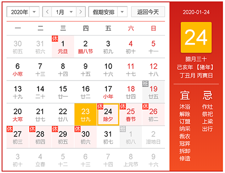 放假时间:2020年1月24日(周五)——2020年1月30日(周四),共七天。