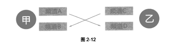 第三种是双方各拥有一个网站:甲方网站设计中有A、B两个子频道,乙方网站中有C,D两个子频道。则甲方用A频道链接乙方的D频道,乙方用C频道链接甲方的B频道(如图2-12所示)。